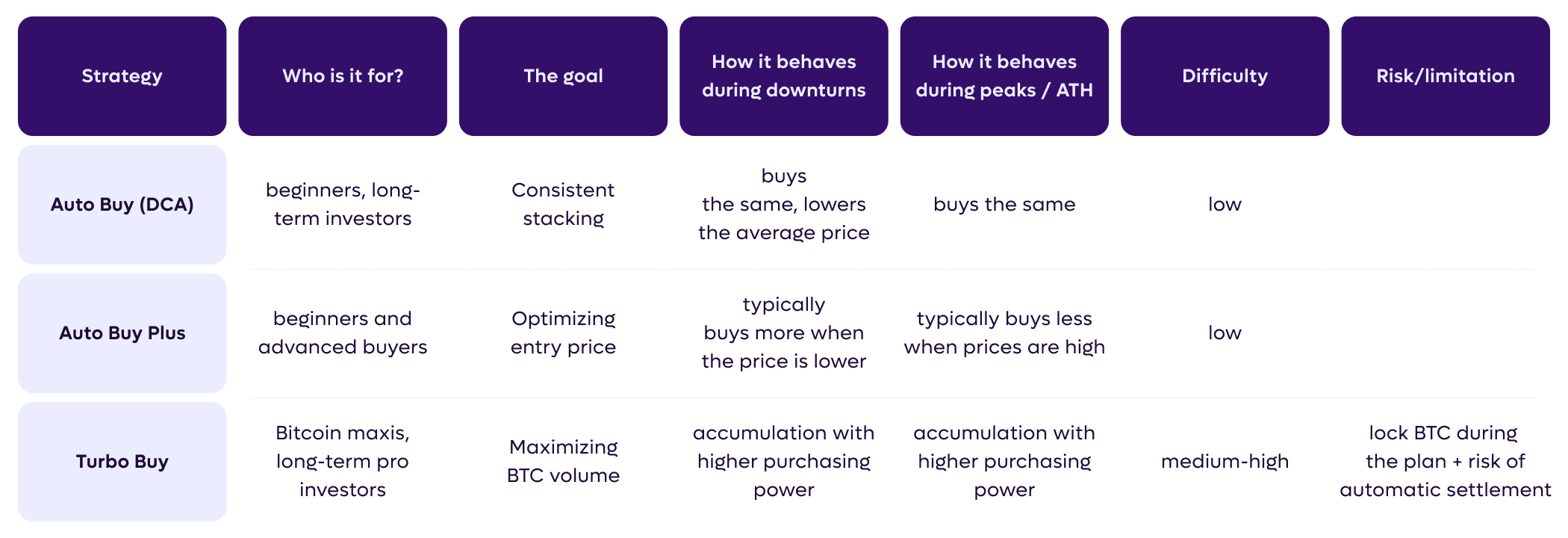 - Turbo Buy is designed for investors who plan to invest long-term (ideally at least 2–3 years) with regular amounts. They understand that volatility is a natural part of the Bitcoin market and do not plan to close the plan during a long-term dip.