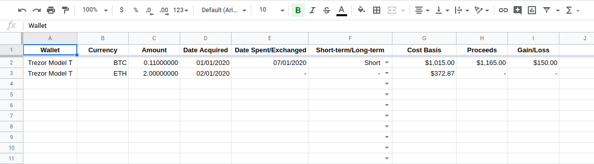 This is the simplest part of the process, but can also be the hardest to remember to do regularly. Make sure you keep track of all the crypto wallets you use and the holdings in each one, and do the same for each crypto exchange you use. When you buy crypto with fiat currency, make sure you note down the date, exactly how much cryptocurrency was involved in the transaction, and the total cost you were charged in USD, including transaction fees. Then take down the same info every time you make a crypto exchange (like BTC for ETH) or sale (like converting your BTC to USD or making a purchase with Litecoin). Note that when you're exchanging, you'll need to record both currencies' values in USD. Keep all this data in a single spreadsheet that you back up frequently.