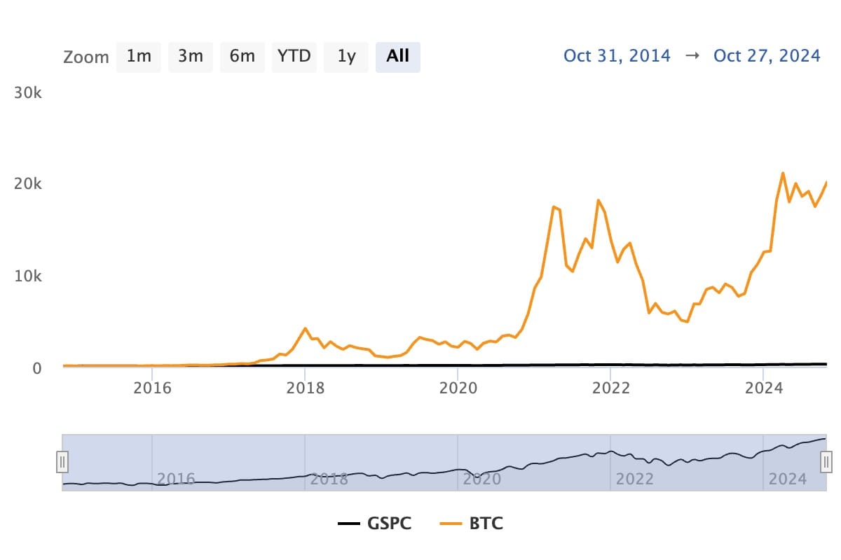 Zooming out to a 10-year view, however, puts a different spin on the S&P vs BTC.
