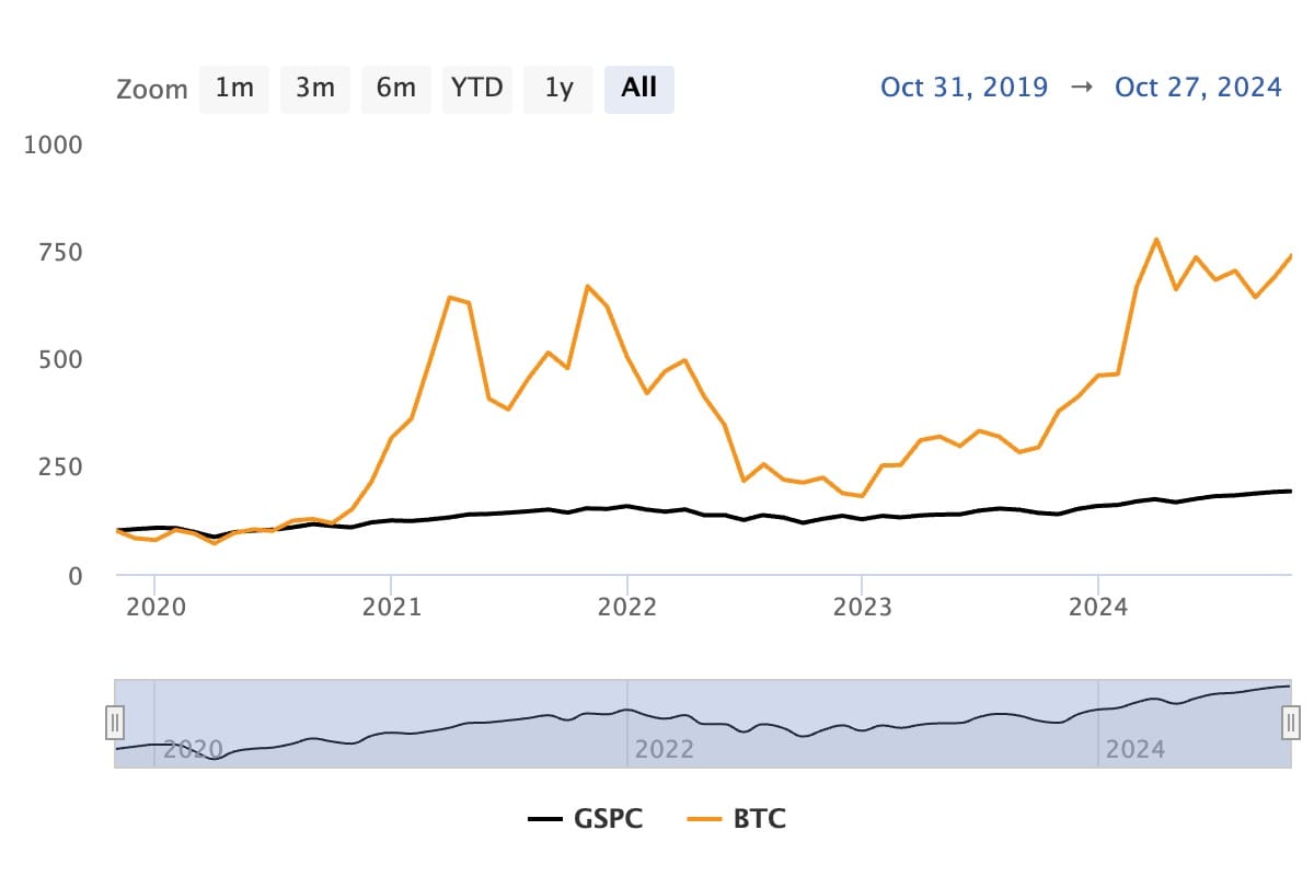 Both the S&P and BTC show positive growth trends over the last 5 years.